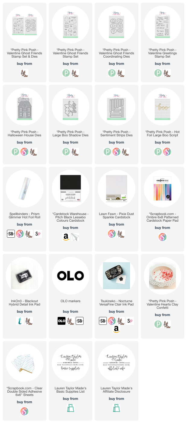 Next, I focused on the sentiment. I used the Hot Foil Large Boo Script to create a stunning sentiment with an iridescent rainbow finish, cutting it out with the Large Boo Shadow Dies. For the second part of the sentiment, I stamped “love you” onto a Sentiment Strip, aligning it perfectly behind the “boo” for a playful yet polished design. To tie it all together, I colored two adorable ghosts from the Valentine Ghost Friends Stamp Set. Keeping their hues light and pinkish, I added subtle shading and details like rosy cheeks and ombre shaded heart-shaped sunglasses for a sweet touch before using the Coordinating Dies to cut them out.