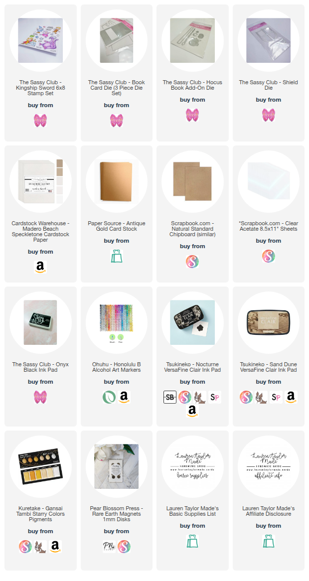 Today’s card is a fun dimensional project using The Sassy Club and a magical book inspired design. I started by stamping the images from the Kingship Sword stamp set using Onyx Black ink, then colored them with Ohuhu Honolulu B alcohol markers. Once everything was colored, I placed the panel back into my MISTI and restamped the images with Nocturne Versafine Clair ink to get a crisp, bold outline. I used my Scan N Cut to cut out all of the images so they were ready to build my scene.