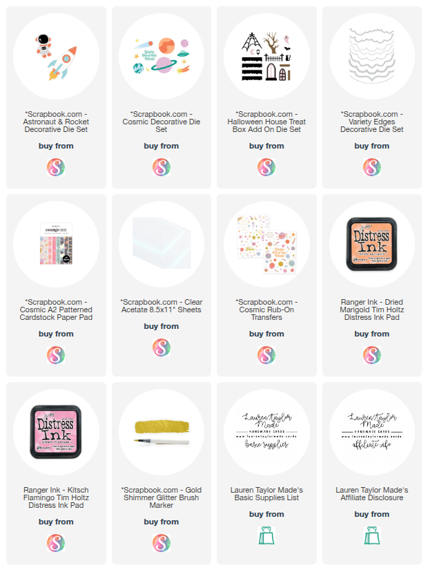 For the focal point, I die cut the sentiment “You’re Out of This World” for the inside of the card and a rocket from the Astronaut & Rocket die set. I inked the rocket with Kitsch Flamingo and Dried Marigold Distress Ink to deepen the edges and brighten the flames. A bellyband made of clear acetate slides over the card to keep it closed, with the rocket attached to the overlap so it looks like it’s floating. To meet one more Craft Roulette parameter, I tucked a little gray cat inside the rocket from the Halloween Treat Box Add-On die set, and I finished with a splatter of gold shimmer for that extra shine.