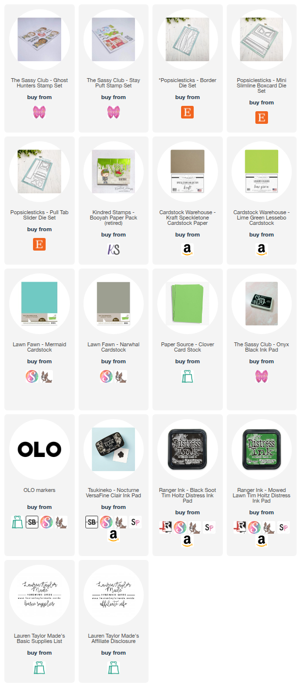 For this Sassy Sunday and the last day of the month, I wanted to create something fun and sorta spooky using stamps from The Sassy Club. This project is inspired by a certain iconic ghost-hunting crew, but I kept everything in the playful Sassy Club world by using the Ghost Hunter and Stay Puffed inspired stamp sets. I stamped all my characters in Onyx Black Ink, colored them with my OLO markers, and cut them out using my Scan N Cut. To build the interactive scene, I combined the Mini Slimline Box Card Die Set and the Pull Tab Slider Die Set from Popsiclesticks. My box card base pieces were die cut from kraft speckletone cardstock, clover green, narwhal gray, and a grassy panel made with one of their border dies.