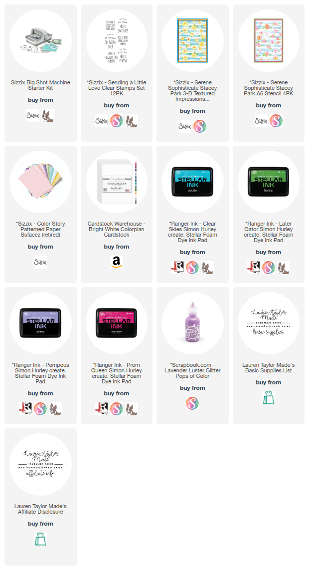 Next, I die cut a pink patterned paper oval from Sizzix, stamped the sentiment “sending a little love your way” in Prom Queen ink, and added it to the center of my card with foam adhesive. I die cut the large flower and leaves from the same starter kit cardstock, deepened the colors with coordinating inks, and layered them beneath the sentiment oval for extra texture. To finish, I added Lavender Luster Glitter Pops of Color to the flower centers for sparkle and mounted everything onto an A2 card base. I love the soft and serene look this card gives — perfect for sending a little love any time of year!