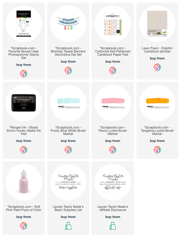For the focal point, I stamped the goose image using a gray ink and colored it with luster brush markers, keeping the look light and simple. I added a touch of blue shimmer for soft shadowing, then fussy cut the image, including a small opening between the legs for extra detail. I popped the goose and banner up with thin foam adhesive and arranged the banner so it looks like the goose is holding it in its beak. I added the tassels to each side and stamped the sentiment “you’re my favorite goose” directly onto the panel. Once everything was assembled, I adhered the panel to an A2 card base using a ruler to keep it centered. To finish the card, I added small soft pink pearl pops of color to the tassels for a subtle bit of shine and texture.
