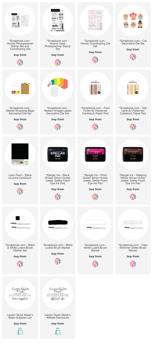 Next, I ink blended the bow and sunglasses with Prom Queen Stellar Ink and stamped small hearts from the Howdy stamp set along the bottom of the bag. I stamped the sentiment "You Never Go Out of Style" in the same pink ink onto white cardstock and die cut it with the coordinating Howdy die. I layered the sunglasses by gluing the pink frames to the black frames and added the black lenses inside. I tied the bow to the back handle so it looked like a scarf tied to a purse. I assembled the cat by layering all of the facial details onto the gray head and lightly ink blending with Black Widow Stellar Ink to add subtle shading. I glued the cat head and white stitched collar to the bag so it looked like the cat was sitting inside. I splattered black and white Luster Brush markers onto the cork label and let it dry, then popped the bag and sentiment onto the cork piece with 1mm foam adhesive. I attached a gingham print from the Oak Lane A2 paper pad to a top folding card base and glued the cork panel to the center. To finish the card, I added clear shimmer glitter brush to the sunglasses lenses and a little shimmer to the bow.