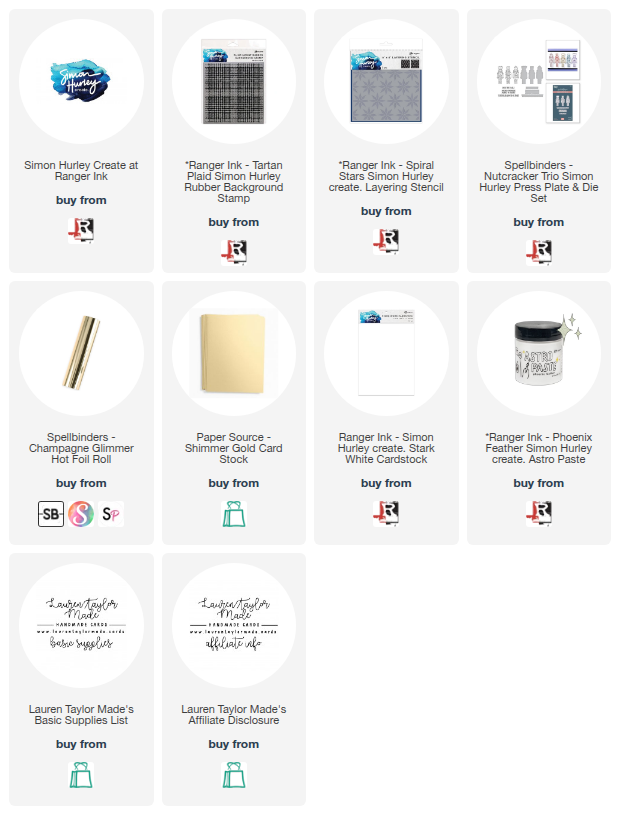 I had so much fun creating this festive card featuring the new Simon Hurley and Ranger Ink products, combining last week's release with new ink pads released today! I started by cutting a piece of gold cardstock to A2 and attaching it to my card base. Next, I stamped the Tartan Plaid cling background stamp in Cookie Dough Stellar Ink onto a piece of Stark White Cardstock cut to 4" x 5¼". For the focal panel, I cut another piece of Stark White Cardstock to 3¼" x 4½" and stenciled the Spiral Stars Layering Stencils using Ivy League and Love Bomb Stellar Inks. Before removing the second stencil, I added a layer of Phoenix Feather Astro Paste to give it an extra festive sparkle and texture; the shimmer is so good!