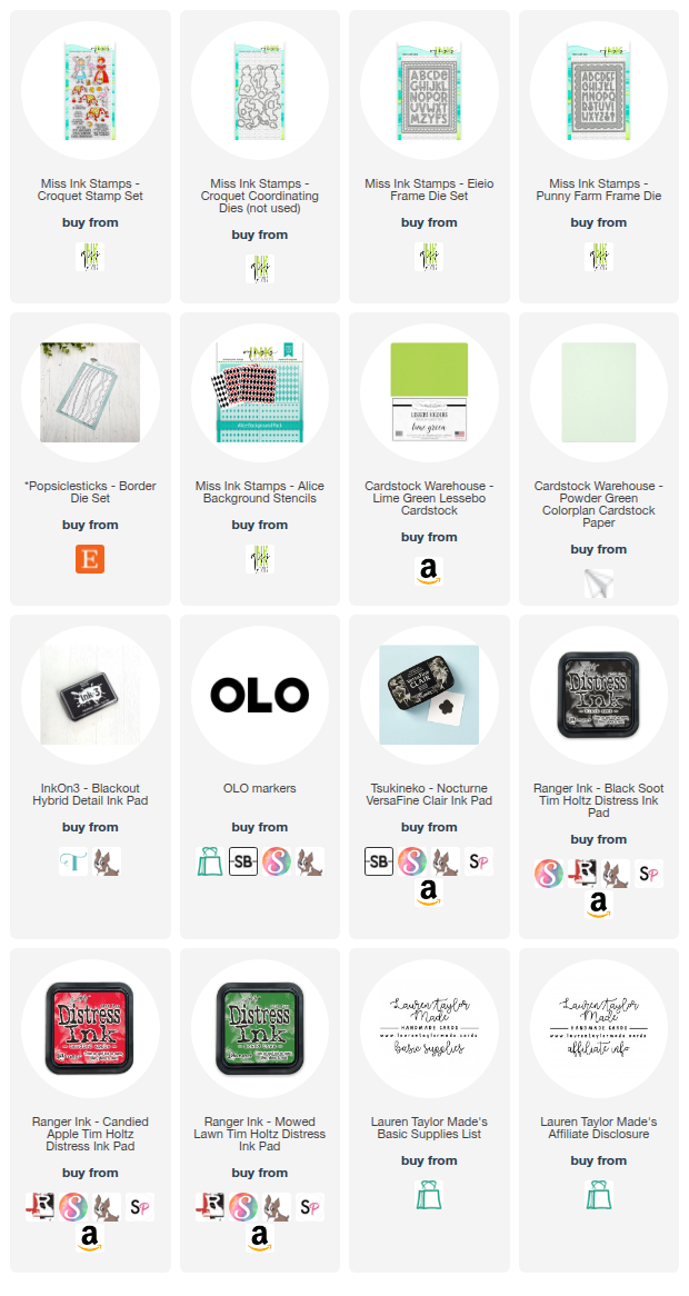 I created a fun croquet inspired card using a mix of stencils, dies, and stamps, with almost everything coming from Miss Ink Stamps. I started by stenciling the Alice Background Stencil onto white card stock using black soot and candied apple distress inks. Once the background was fully blended, I die cut it using the largest rectangle from the Punny Farm Frame die set. For the next layer, I took the stitched rectangle from the EIEIO Frame Die Set and cut it from some powder green card stock. I stamped the sentiment you are flamazing in the top left corner using nocturne versafine clair ink. I used the same stitched rectangle die to cut a second panel from lime green card stock, and then used one of the grassy borders from the Popsicle Sticks Border Die Set. I blended a little mowed lawn distress ink onto the grass pieces and layered them onto the blue sentiment panel. Once everything was glued together, I adhered that panel to the middle of my stenciled background and then attached it to a top folding A2 card base.