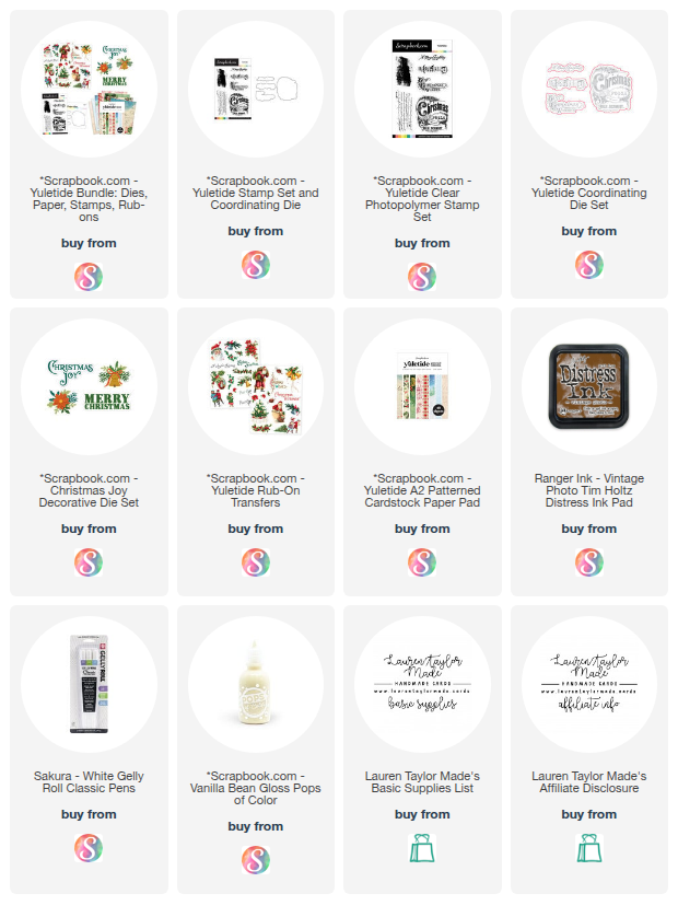 For today’s card, I created a vintage-inspired holiday design using the beautiful Yuletide collection from Scrapbook.com. I started by attaching a piece of dark green patterned paper from the Yuletide A2 Paper Pad to a top-folding A2 card base. Then I trimmed another green pattern with holly and bells in the upper left corner to 4” x 5¼” and added Yuletide Rub-Ons for extra holly, florals, and a postcard cancellation mark. To give the background more texture, I stamped the solid-looking image from the Yuletide Clear Stamp Set around the panel using Vintage Photo Distress Ink. I saved a quarter-inch strip from trimming the panel, flipped it over to show the striped green pattern, and lightly distressed the edges with a blending brush and Vintage Photo Ink. I also stamped the music notes from the same stamp set onto cream patterned paper, die cut it with the coordinating Yuletide die, and inked the edges for that perfect aged look.